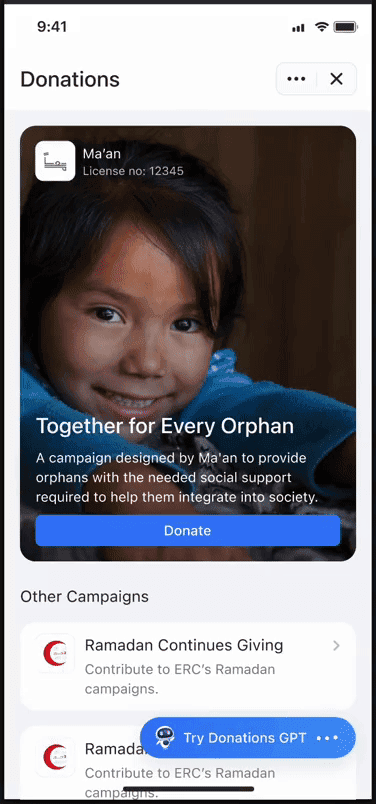 Since it’s a charity GPT, the first prompt is automatically generated: “I want to donate” to reduce work on user side.