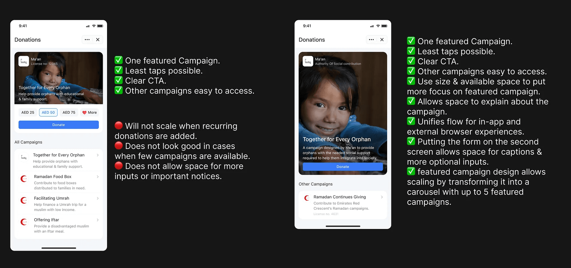 Designing the donations homepage introduced a new challenge, it needs to look good and have a logical flow no matter how many campaigns we may have at any point in time and it needs to allow space to add more features like recurring donations in the second phase.