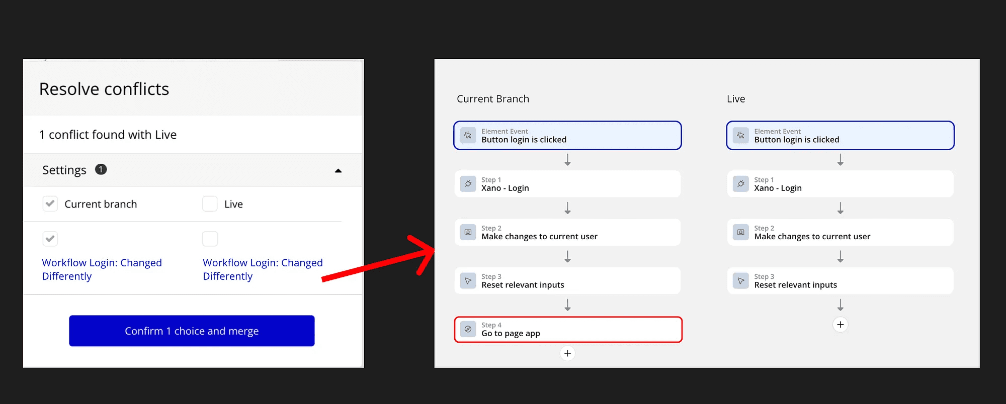 Don’t make me dig to find what ‘changed differently’ means. Instead of click on something > load > see on relevant branch let me see it side by side, like the description.