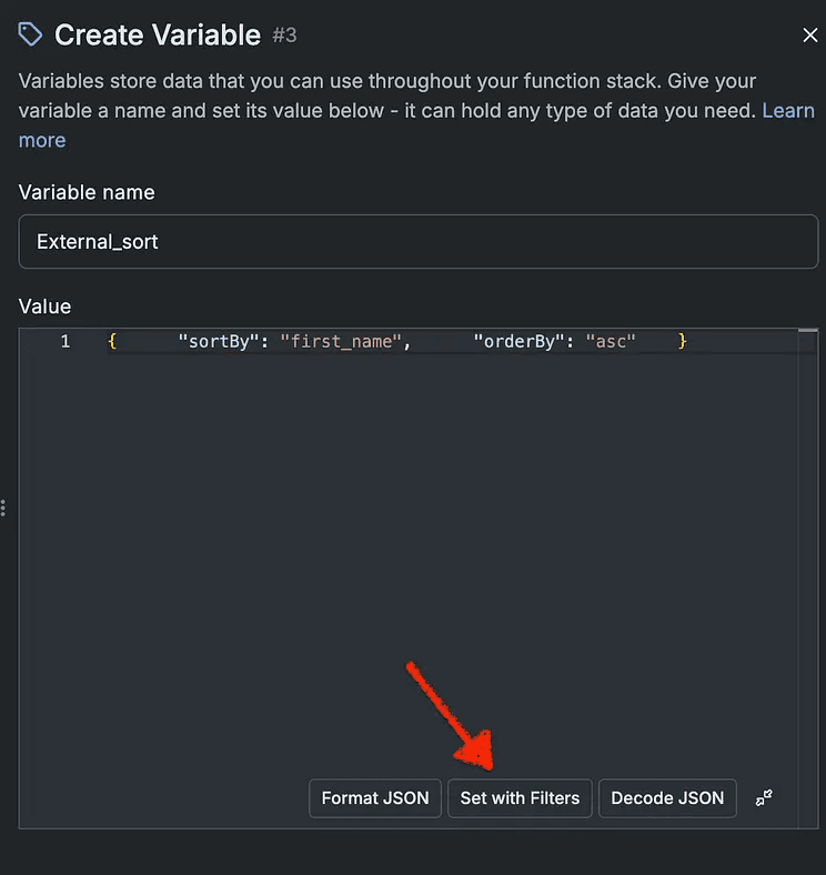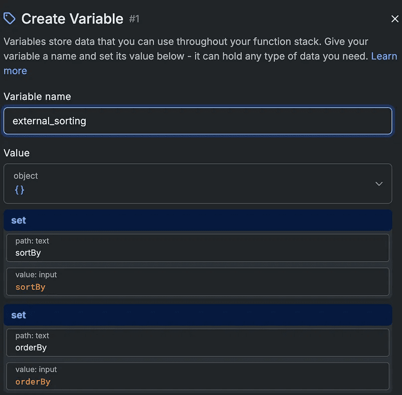 in your function stack, create a variable. Name it “external sort” for example and in the value input paste the following JSON structure. Don’t worry about the actual values we will change them.