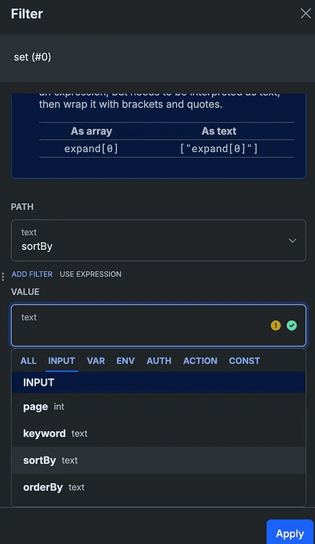 click “set with filters” and select the relevant input we created in the first step for both.