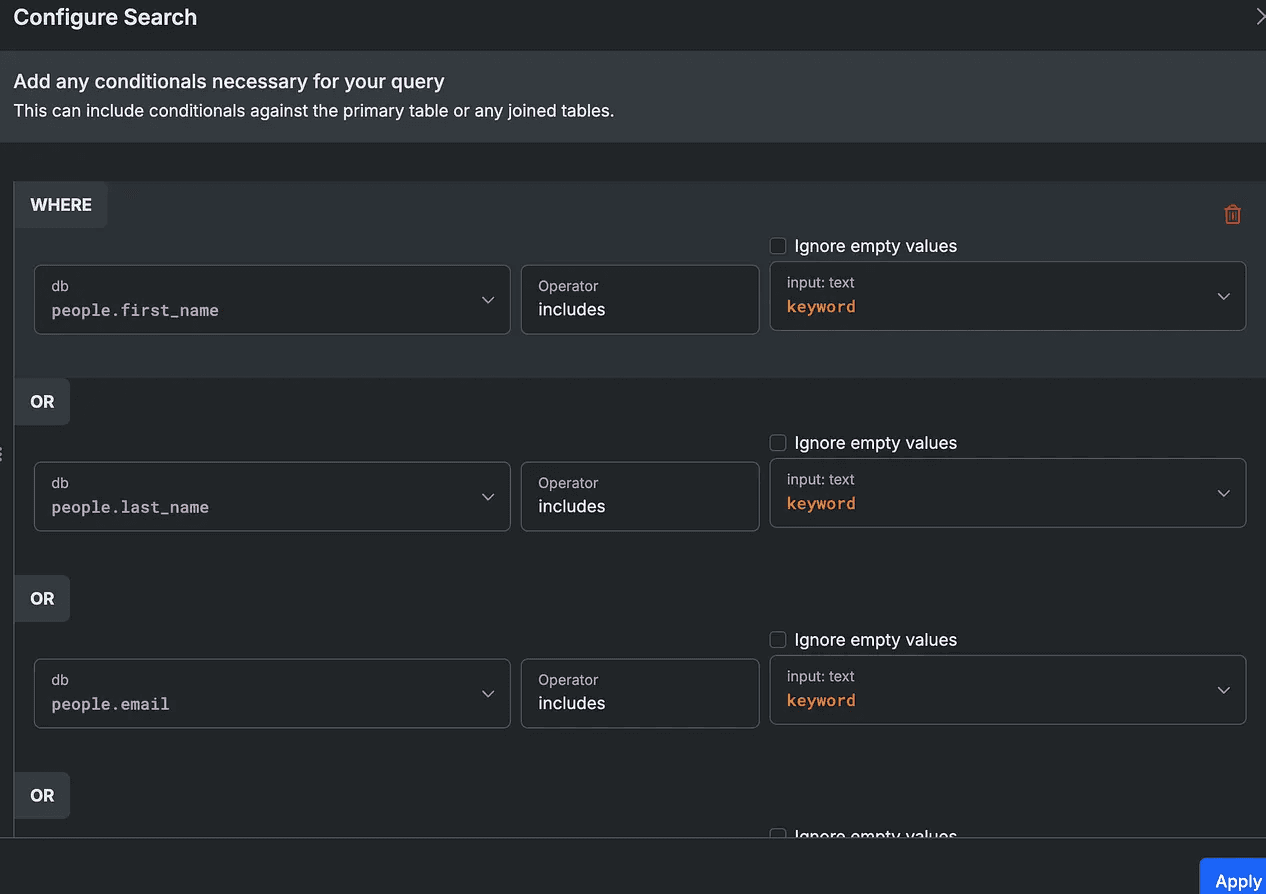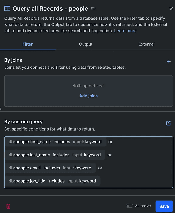 in the Filter tab of your Query function, select by custom query and filter all relevant fields by the “keyword” input you just created.