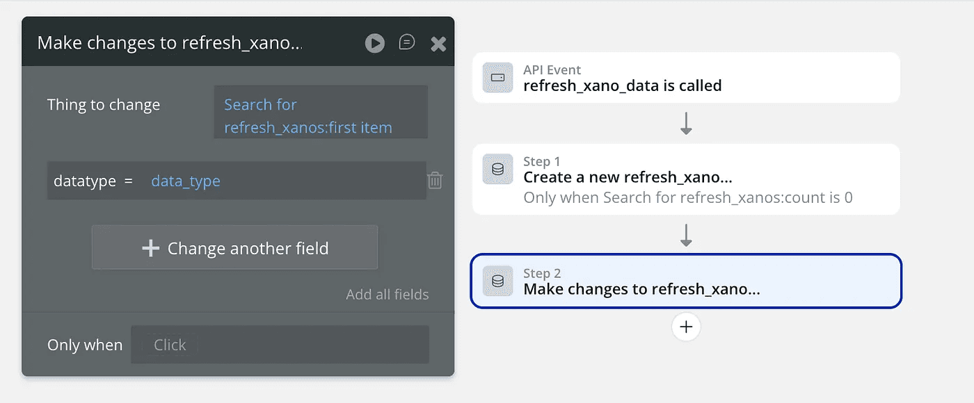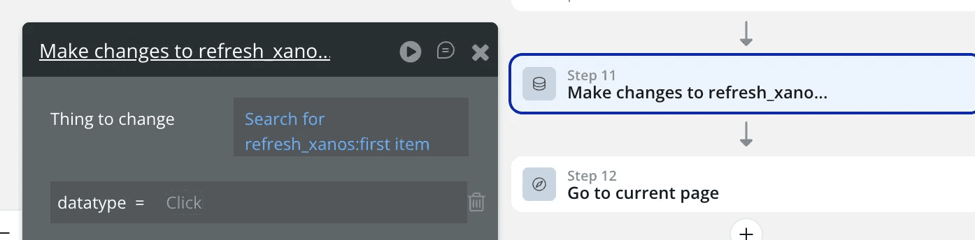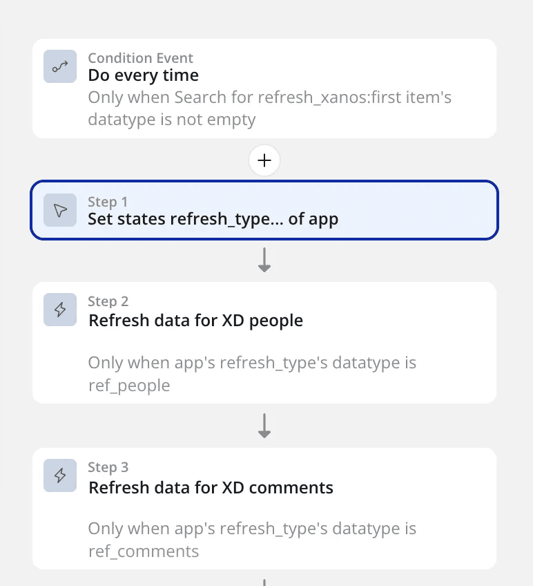 5.1 Add a workflow when condition is true → when the relevant refresh_xano record in Bubble is updated: we set this record as a custom state to the page containing the XD elements we want to refresh.