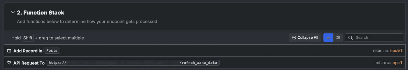 6. Now in Xano, for every relevant post/patch/delete endpoint, you need to add a step in your function stack to send the webhook